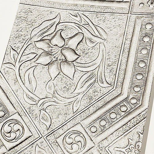 江戸時代にオランダとの貿易により輸入された金唐革の代用品として和紙を使うことで、擬革紙の技術を培い、金唐革紙として明治期に輸出するまでになりました。重厚なロール状の版木を使い、和紙を手打ちして柄を打ち出し、銀箔、柿渋、叩き刷毛、ワニスなどを用い彩色しています。凹凸状のデザインが美しい革風の紙です。