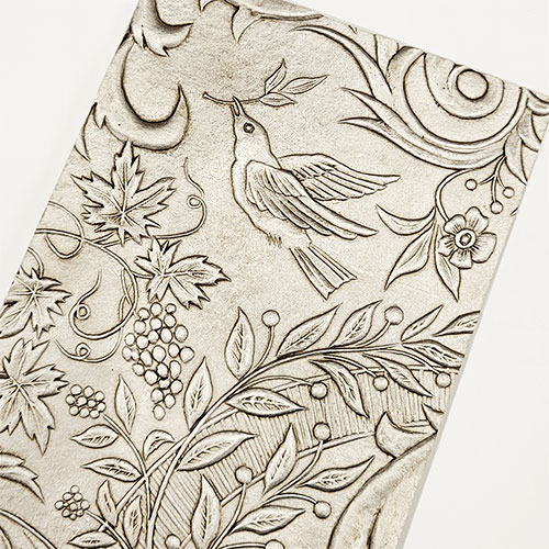 江戸時代にオランダとの貿易により輸入された金唐革の代用品として和紙を使うことで、擬革紙の技術を培い、金唐革紙として明治期に輸出するまでになりました。重厚なロール状の版木を使い、和紙を手打ちして柄を打ち出し、銀箔、柿渋、叩き刷毛、ワニスなどを用い彩色しています。凹凸状のデザインが美しい革風の紙です。