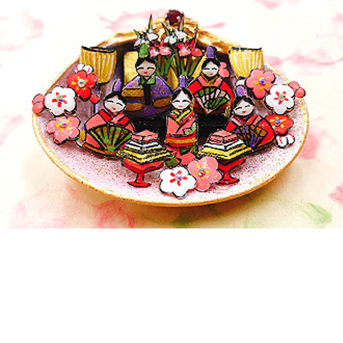蛤の中にお雛様、お内裏様をおさめた貝雛です。ペーパークラフト「シャドウアート」の技法を用い、立体的に表現しています。 当店シャドウアート教室講師、竹野幸代先生による作品です。