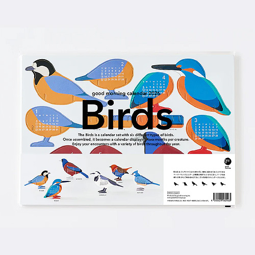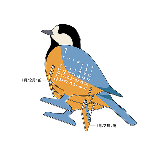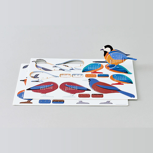 のりやハサミなどを使わずに、簡単に組み立てることができるペーパーキットカレンダーです。6種類の鳥がセットされており、パーツを台紙から取り外して鳥を組み立てると、2か月表記のカレンダーになります。アメリカ、ヨーロッパなど海外の美術館、博物館でも大変人気の高い商品です。