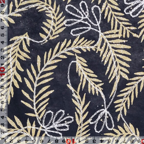 ししゅうP黒地ベージュ 白刺繍 シダ文様 銀ラメ